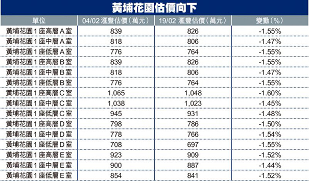 本報就黃埔花園11期1座「疫廈」進行估值,公佈死亡個案當日,該座由低至高層A至H室單位網上滙豐銀行進行估價,事隔逾兩周,該座單位估值全線報跌,跌幅一律1.5%,反映銀行對整體市道及疫廈造價取態。如該座中層A室,2月4日匯豐銀行網上估值818萬元,最新估值跌至800萬邊緣,估值報806萬元。大單位同樣不能倖免,高層F室,死亡個案宣佈當日,單位估值1,160萬元,相隔逾兩周,最新報1,142萬元,下跌18萬元。
