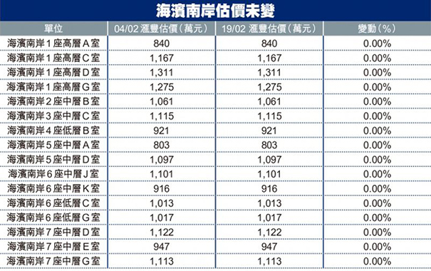 | 同區未有疫情個案的海濱南岸,本報抽查屋苑各座單位,無論樓層高低座向,近期估值無變化。 |