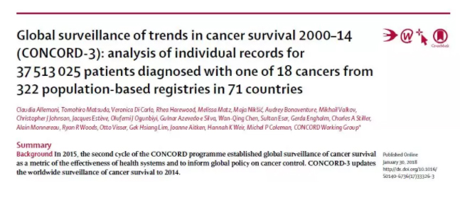 2018年1月30日,英國頂尖醫學雜誌「The Lancet」(中文名《柳葉刀》)發表了於全球人口癌症生存率方面最詳盡、樣本資料最多、最權威的研究報告之一的「2000-2014年全球癌症生存率變化趨勢監測研究報告,Global surveillance of trends in cancer survival 2000–14 (CONCORD-3)」。報告中不但詳細分析了全球71個國家和地區、18種主要癌症患者的五年生存率變化趨勢。更有顯示出不同地區差異及部分國家和地區所採取的癌症預防、篩查措施等,全面性非常之高。