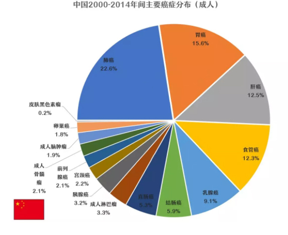 - 中國人的發病占比方面,最高的是肺癌(22.6%),其次是胃癌(15.6%),隨後為肝癌(12.5%)、食管癌(12.3%)和乳腺癌(9.1%);