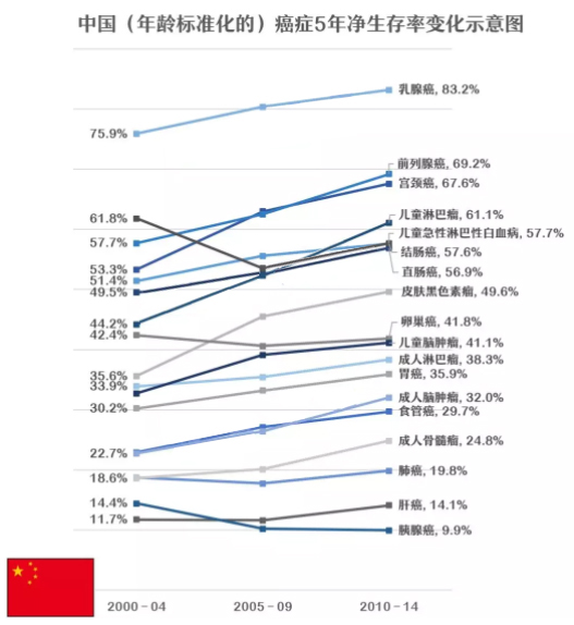 - 中國於腦腫瘤和造血系統惡性腫瘤方面 (骨髓瘤、淋巴瘤、白血病)的5年生存率,遠低於日本和美國。同樣,發病率較高的癌症(肺癌、胃癌和肝癌)5年生存率亦與鄰居國家日本和韓國有較大差距,5年生存率相差接近一倍;