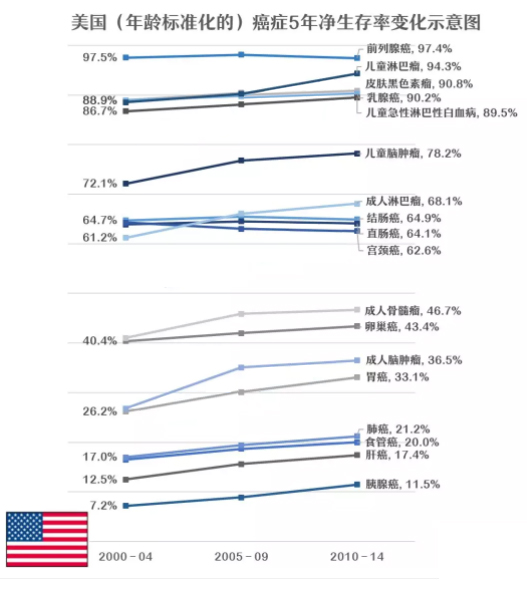 以大多數癌症為例,癌症5年生存率位於全球前列的國家分別為:美國、加拿大、澳大利亞、紐西蘭,芬蘭、冰島、挪威、瑞典等。