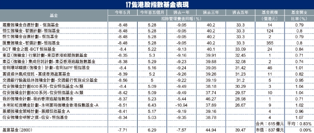 事實上,16隻由不同受托人管理的指數基金(見表),表現回報差距不遠。基金規模越大,不代表收費越平,例如收得最平的兩間(0.71%),基金規模只有1億。規模最大的滙豐,旗下恒指基金達355億元,連同恒生等四隻指數基金,合共佔指數基金整體規模615億元的八成份額,每年收取管理費近4億元。